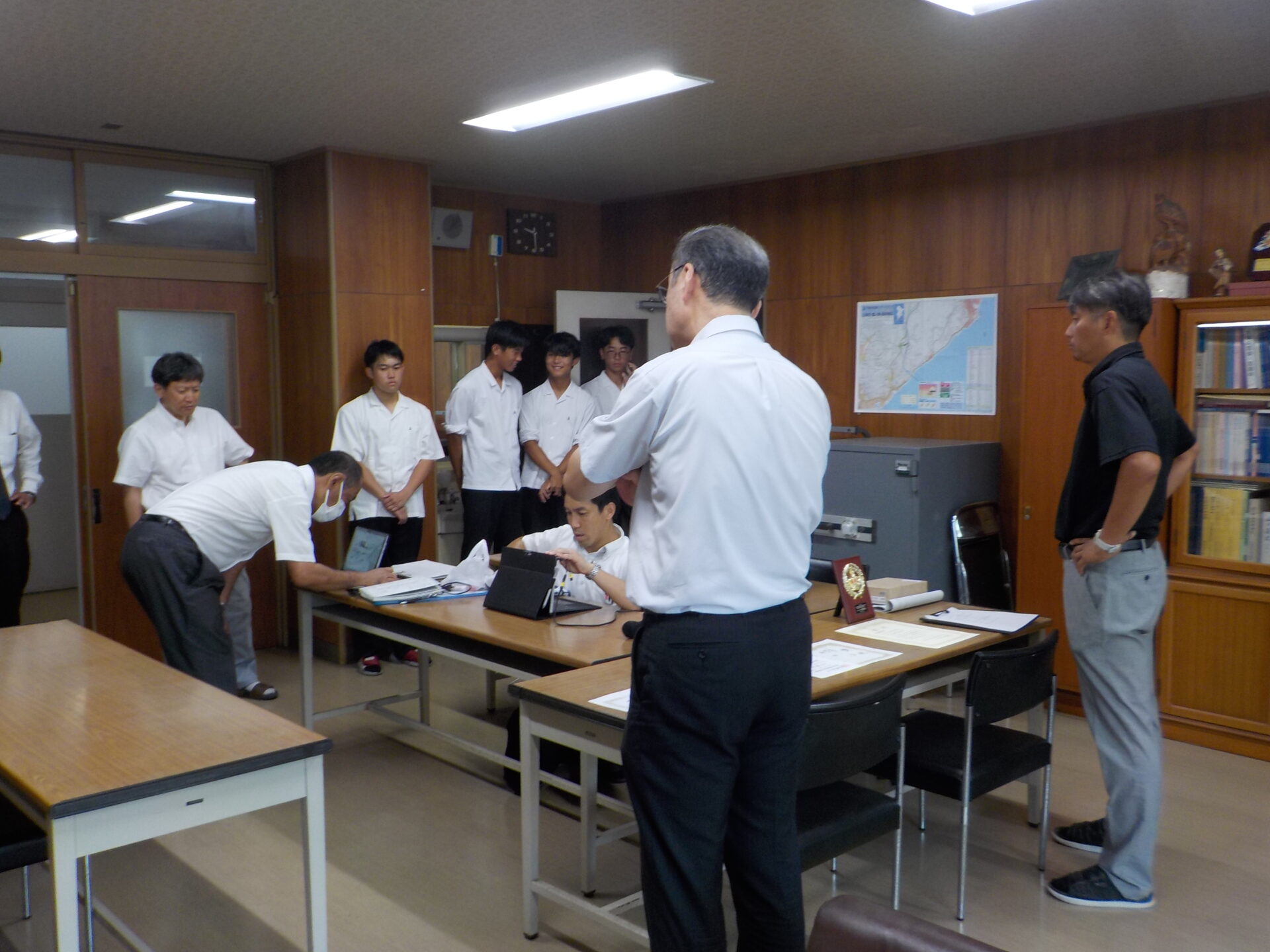 8月25日に2学期の始業式、賞状披露がオンラインで行われました。水泳部、硬式テニス部、陸上競技部と課題研究物理班の賞状披露がされました。始業式では校長から「挑戦」「忍耐」「覚悟」をキーワードに2学期に向けた講話をしていただきました。
